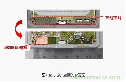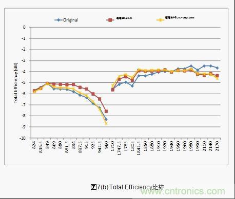 接下來將針對天線小型化的有效性進(jìn)行檢測。一般來說天線具有改善接地距離的特性。但是,天線占據(jù)空間(排除了GND領(lǐng)域)很大的話天線以外的 元器件安裝空間就會受壓迫。天線小型化和縮小天線空間迫在眉睫。當(dāng)天線空間的一部分被GND占據(jù),對這時候的天線特性的變化進(jìn)行評價。天線空間的寬度為52mm,其中13mm被GND占據(jù),low band的特性劣化,變成了跟LC電路等同的Total Efficiency(圖7(b))。這就意味著實際上天線空間的面積可減少25%。