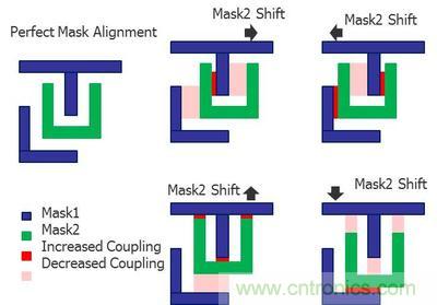 圖2:雙重成像(DP)的光罩可能存在的未對(duì)準(zhǔn)情況要求設(shè)計(jì)人員評(píng)估更多寄生參數(shù)提取的corners,以驗(yàn)證集成電路的時(shí)間選擇和性能。