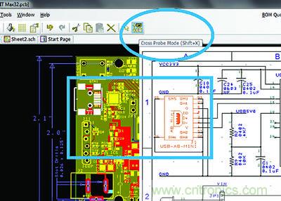 6.0版本中的交叉探測(X-probe)功能能夠在軟件內(nèi)實現(xiàn)原理圖與PCB設(shè)計視圖之間的即時引用,從而進一步加快設(shè)計過程。通常情況下在PCB視圖中元件的識別是比較直觀、容易的,但在原理圖中找到該元件的對應(yīng)符號卻不那么容易,除非用戶對整個系統(tǒng)都了如指掌。通過交叉探測功能,用戶只需在任一視圖中點擊某個元件,即可迅速跳轉(zhuǎn)到對應(yīng)視圖中的同一元件。該功能可從PCB視圖跳轉(zhuǎn)到原理圖,反之亦然。