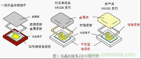 一般的晶體振蕩子采用的是凹形陶瓷電路板,本公司采用的是跟CERALOCK®相同的平板型電路板。因此提高了包裝內(nèi)部的空間利用率,與一般的晶體振蕩子相比能搭載更大的晶體元素。此外,由于金屬帽和電路板連接,常規(guī)產(chǎn)品采用的是樹脂封裝,XRCGD系列采用的是熔接封裝,通過密封構(gòu)造對應(yīng)了頻率的高精度化。(圖1)