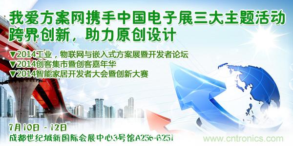 【導(dǎo)讀】我愛方案網(wǎng)和CNT Networks攜手中國電子展主辦的“2014工業(yè)、物聯(lián)網(wǎng)和嵌入式設(shè)計方案展暨中國西部電子開發(fā)者與創(chuàng)客論壇”即將于2014年7月10日-12日在成都開幕。同期同地,我愛方案網(wǎng)還將舉辦2014創(chuàng)客集市暨創(chuàng)客嘉年華活動,以及與千家網(wǎng)合辦2014智能家居開發(fā)者論壇暨創(chuàng)新大賽(成都)。