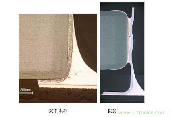 GCM系列的話,在1000°溫度循環(huán)的情況下會(huì)發(fā)生焊接裂縫,而KCM/KC3系列的話即使在2000°溫度循環(huán)的時(shí)候也看不見焊接裂縫,可見對(duì)于熱應(yīng)力可確保高可靠性。