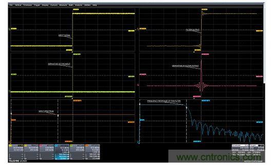 圖1:先將快速邊沿測試信號加到濾波器的輸入端(左上),然后用濾波器輸出(右上曲線)對它進(jìn)行微分(右中),最后求FFT的平均值(下右),就可以得到濾波器的頻率響應(yīng)。左下邊曲線中的頻譜展示了微分過的階躍輸入信號的頻率平坦度。