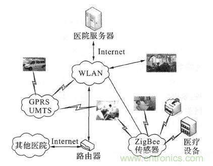 系統(tǒng)中包括無線個人網(wǎng)絡(luò)(wireless person2al area network,WPAN ) 、ZigBee網(wǎng)絡(luò)以及一系列醫(yī)療監(jiān)護網(wǎng)絡(luò)的醫(yī)療傳感器節(jié)點。本系統(tǒng)具有良好的擴展性,例如醫(yī)護人員在急救途中或在其他醫(yī)院可以分別利用WLAN /UMTS網(wǎng)關(guān)和互聯(lián)網(wǎng)與系統(tǒng)進行信息交互。