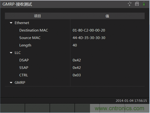 接收測試頁面用于接收來自其他設(shè)備發(fā)送的GMRP報(bào)文。界面枚舉出報(bào)文類型,以及組播地址。并且對報(bào)文內(nèi)容也可以做到解析。如圖 1-4所示: