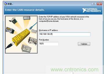 啟動(dòng)Masurement & Automation Explorer軟件,選擇設(shè)備和接口,在添加網(wǎng)絡(luò)設(shè)備中,使用Manual Entry of Raw Scoket(手動(dòng)輸入原始SOCKET)方式連接,ZDS2024示波器采用端口號(hào)5025來接收SCPI命令。如圖2和圖3所示。設(shè)置好后,可進(jìn)行測試,確保連接成功。