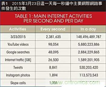網(wǎng)際網(wǎng)路實現(xiàn)了廣泛的資料通訊服務,如電子郵件、視訊下載、Google搜索、推特(Twitter)消息發(fā)送、Skype電話等等。表1列出了每天和每一秒鐘的主要網(wǎng)際網(wǎng)路活動數(shù)量。