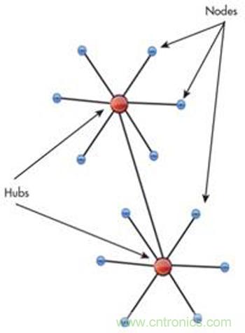 在網(wǎng)路術語中,所有連接到網(wǎng)路的設備都被分類為網(wǎng)路節(jié)點。在最基本的網(wǎng)路結(jié)構中,各節(jié)點通過集線器連接在一起。即多埠設備將任何到達的資訊包復制到與之連接的所有其他埠(節(jié)點)(圖1)。