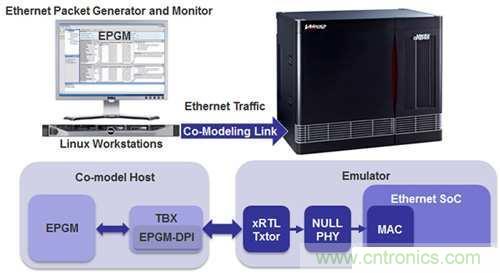 將這種設置與采用虛擬方法的設置進行比較,如明導國際(Mentor Graphics)的虛擬乙太網(wǎng)設備(VirtuaLAB)。在此場景中,裝有Linux環(huán)境的工作站連接硬體加速器,在工作站上用軟體對乙太網(wǎng)測試儀實現(xiàn)一樣的行為模式。基于成熟的實現(xiàn)智慧財產(chǎn)權(IP),模型準確再現(xiàn)了實際的物理測試儀。