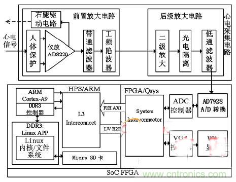 【導(dǎo)讀】本設(shè)計(jì)實(shí)現(xiàn)了一種基于片上系統(tǒng)現(xiàn)場(chǎng)可編程門(mén)陣列(SoC FPGA) 的心電信號(hào)(ECG)檢測(cè)系統(tǒng)。系統(tǒng)通過(guò)具有高輸入阻抗、高共模抑制比和低噪聲的前置采集放大電路,實(shí)現(xiàn)心電信號(hào)的拾取和預(yù)處理。