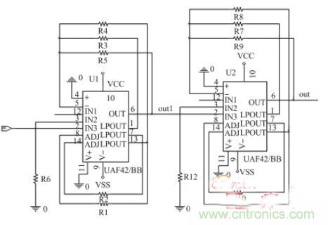 濾波器和50 Hz 工頻陷波器。帶通濾波器電路的通頻帶為0.05~ 100 Hz,濾除了基線漂移等低頻干擾和高頻噪聲,工頻陷波器能有效濾除工頻噪聲。通過(guò)UAF42 可以方便地設(shè)計(jì)出各種類型和頻率特性的濾波器,只需要計(jì)算出合適阻值的外接電阻器,經(jīng)過(guò)簡(jiǎn)單的連接就能很好地滿足設(shè)計(jì)要求,免去了在有源濾波器的設(shè)計(jì)當(dāng)中對(duì)電容器、電阻器的選型和匹配的工作。工頻陷波器電路圖如圖3 所示。