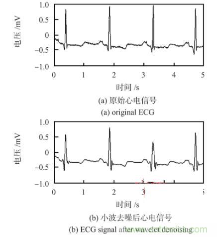 采用小波分析的方法進(jìn)行心電信號(hào)去噪。小波分析由于能同時(shí)在時(shí)域和頻域中對(duì)信號(hào)進(jìn)行分析,具有多分辨分析的功能,所以,在不同的分解層上有效地區(qū)分信號(hào)的突變部分和噪聲。對(duì)含有噪聲的原始心電信號(hào)進(jìn)行小波分解后,噪聲部分主要集中在高頻小波系數(shù)中,包含有用信號(hào)的小波系數(shù)幅值較大,但數(shù)目少;而噪聲對(duì)應(yīng)的小波系數(shù)幅值小,數(shù)目較多?;谏鲜鎏攸c(diǎn),選取無(wú)偏似然估計(jì)閾值對(duì)小波系數(shù)進(jìn)行處理,然后對(duì)信號(hào)重構(gòu)即可達(dá)到消噪的目的。圖7 為心電信號(hào)小波去噪前后對(duì)比,信噪比可以達(dá)到121 dB。