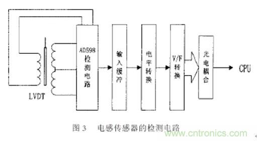 如圖3所示,由于采用了最新的大規(guī)模集成電路,電感傳感器的檢測(cè)電路比較簡(jiǎn)單,且集成電路采用了新的調(diào)制解調(diào)方法和算法,減少了以前的檢測(cè)外差式調(diào)頻檢測(cè)電路方法由于傳感器的激勵(lì)信號(hào)的相角、頻率以及幅值漂移對(duì)檢測(cè)結(jié)果的影響,大大進(jìn)步了檢測(cè)精度和穩(wěn)定性。