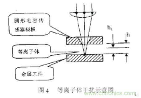 在工件尚未被切穿的瞬間,激光和金屬相互作用,在噴嘴和加工對(duì)象之間產(chǎn)生云霧狀等離子體,改變電容極板之間的介質(zhì),從而對(duì)電容傳感器產(chǎn)生干擾。在正常切割過(guò) 程中,輔助氣體將等離子體從切縫中吹散,對(duì)電容傳感器產(chǎn)生影響較小。但假如加工速度太快和剛開始切割時(shí),由于工件未被完全切穿,激光照射點(diǎn)四周會(huì)產(chǎn)生等離 子體云,對(duì)電容傳感器產(chǎn)生干擾,嚴(yán)重時(shí)甚至使傳感器無(wú)法正常工作,嚴(yán)重影響加工質(zhì)量。圖4為等離子體干擾示意圖。