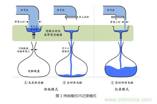 圖 1形象的詮釋了傳統(tǒng)模式和記錄模式的區(qū)別;當(dāng)信號(hào)流很大時(shí),直接存到細(xì)口瓶肯定溢出,只能先存到寬口瓶,存滿(mǎn)后先停下來(lái),再慢慢傳回細(xì)口瓶;當(dāng)信號(hào)流不大時(shí),寬口瓶充當(dāng)傳輸管,將信號(hào)流直接引入細(xì)口瓶,可長(zhǎng)時(shí)間不間斷存儲(chǔ)。