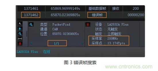 這個(gè)大可放心,通過(guò)強(qiáng)大的搜索或過(guò)濾功能,進(jìn)行“錯(cuò)誤幀”定位。不用幾十秒,就完成了100多萬(wàn)幀數(shù)據(jù)的排查,并發(fā)現(xiàn)定位一個(gè)錯(cuò)誤幀(1371462幀),如圖 3所示。