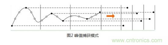 接下來就是峰值捕獲模式,看著名字就知道是什么意思了,就是采集一個(gè)采樣間隔信號(hào)中的最大值和最小值。