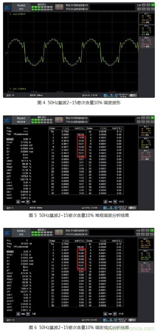 信號二:基波頻率50Hz,含2~15的奇次諧波,各次含量同樣均為10%