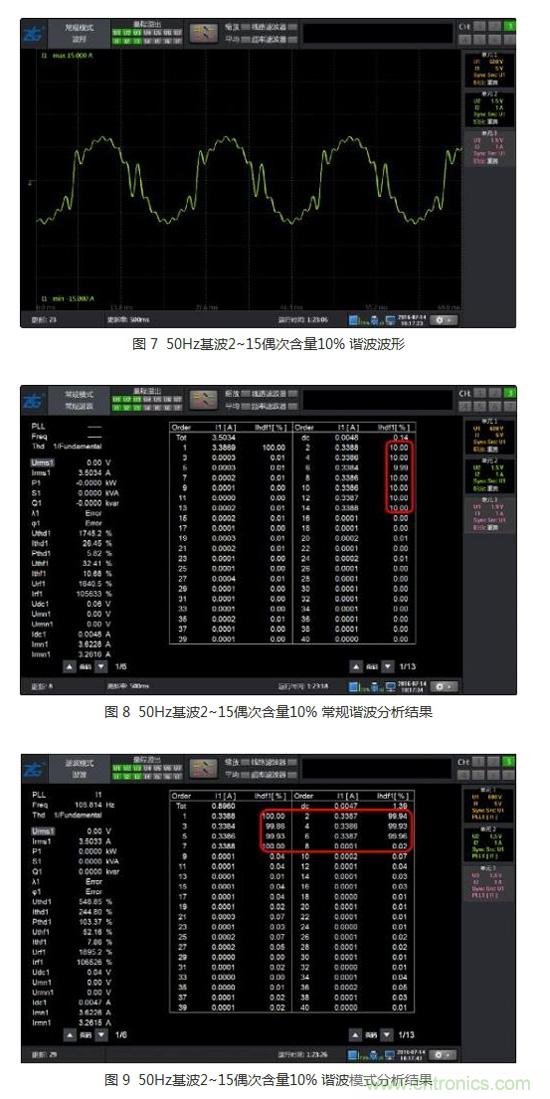 如圖 7所示只包含50Hz基波的2~15次的偶次諧波的波形,受偶次諧波的影響,每個基波周期多了兩次過零,而且頻率與基波相近,PLL的濾波器亦無法濾除該諧波,因此PLL結(jié)果錯誤,導致諧波分析結(jié)果也完全錯誤,此時的常規(guī)諧波分析結(jié)果仍然正確,而且保持了很高的精度。說明常規(guī)諧波可以不受偶次諧波影響,在采樣率和FFT點數(shù)足夠時,具有受被測信號影響低的優(yōu)勢。
