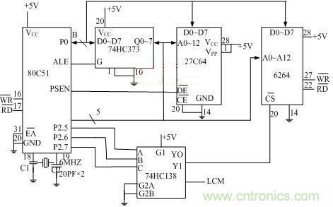在80C51單片機(jī)中,外部I/O口是作為外部RAM來擴(kuò)展的,選址的方法與擴(kuò)充外部RAM的方法完全相同。本電路除了外部的RAM外,還有LCD顯示器作為外部I/O器件,因此,只采用線選址方式是不夠的,應(yīng)采用譯碼選址方式。