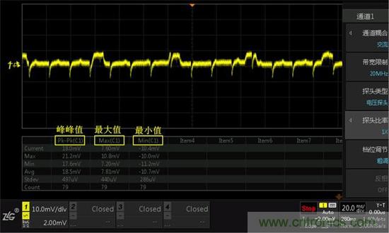 紋波測(cè)試一般以峰峰值來(lái)表示,具體可以使用【measure】進(jìn)行自動(dòng)測(cè)量,如下截圖ZDS2000系列示波器,能支持51種真正意義的參數(shù)測(cè)量統(tǒng)計(jì)功能,基于全存儲(chǔ)深度的基礎(chǔ)上測(cè)量紋波的參數(shù),或者也可以使用“一鍵光標(biāo)”進(jìn)行手動(dòng)測(cè)量,如下圖6所示。