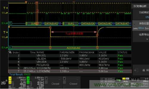 使用I2C時(shí)序分析軟件,它能夠在極短的時(shí)間內(nèi)完成總線信號(hào)的DC特性和AC特性分析,并與器件手冊(cè)標(biāo)稱參數(shù)做對(duì)比,直接輸出測(cè)試結(jié)果(Pass/Fail),同時(shí)支持報(bào)表導(dǎo)出,省去人工錄入數(shù)據(jù)的煩惱,極大的提升測(cè)試效率。具體測(cè)試界面如下圖4所示。
