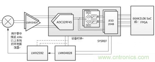 在射頻采樣無線電中,采樣時鐘的質(zhì)量好壞對系統(tǒng)產(chǎn)生的信噪比(SNR)具有強烈影響。LMK04828是兼容JESD204B的超低噪音時鐘抖動清除器,可生成小于100fs抖動、具有射頻采樣能力的時鐘,同時具有一系列收縮或簡化系統(tǒng)的特性。因支持最多七個JESD204B裝置,LMK04828可以為多個ADC32RF45 ADC、數(shù)字模擬轉(zhuǎn)換器(DAC)、FPGA或DSP記時。LMK04828還可以生成系統(tǒng)參考(SYSREF)信號,用于JESD204B系統(tǒng)中確定性延遲,而數(shù)字和模擬延遲可幫助滿足每個JESD204B設(shè)備的關(guān)鍵計時需求。