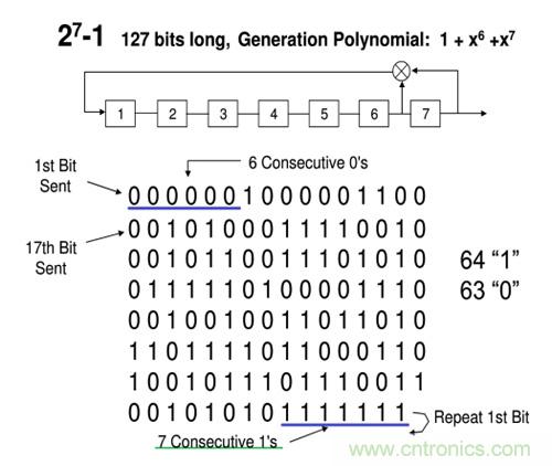 在圖一中可以看到,PRBS7最長是127bit(27-1), 理論上來說,7bit的2進制碼,一共會有27個不同組合,但是,如果碼流全部為‘0’的時候,經(jīng)過異或運算,輸入到寄存器第一位的值還是0, 這樣移位寄存器將會一直輸出為零,移位寄存器被死鎖。所以PRBS碼流不能全部為零。另外,PRBS7 碼流中最長的連續(xù)‘1’個數(shù)為7個,最長的連續(xù)‘0’個數(shù)為6個。127bit的連續(xù)碼流中,一共有64個‘1’,63個‘0’。