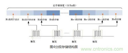 原理如下圖所示:總的存儲深度分為n段,第1段用于顯示,第2段開始存儲,也就是當發(fā)生第一次觸發(fā)時采集的數據存儲到第2段存儲空間中,當第2段存儲空間存儲滿之后,結束第一次觸發(fā),等待第二次觸發(fā)的到來,觸發(fā)后把數據存儲到第3段存儲空間中,以此類推。