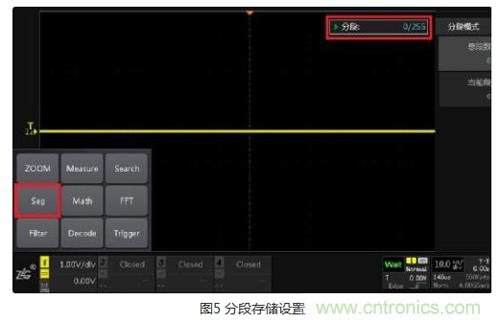 點擊【Seg】,通過調節(jié)時基檔位,在560Kpts存儲深度的狀態(tài)下,將分成255段進行存儲和采集,如下圖5: