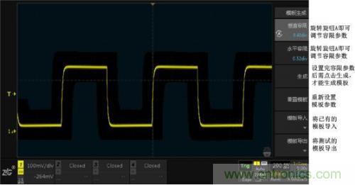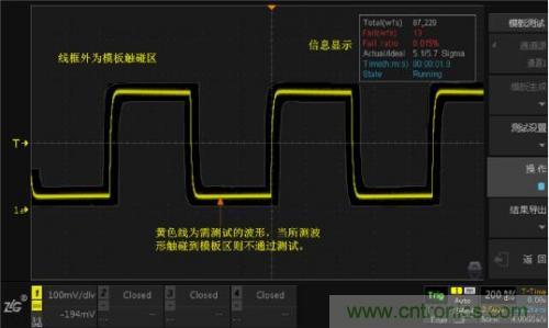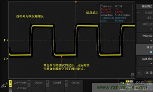 上圖就是模板測(cè)試的測(cè)試界面,其中,線框外為模板觸碰區(qū),波形接觸到該區(qū)域會(huì)被判定為不合格波形,即“Fail”。沒有接觸到模板觸碰區(qū)的波形為“Pass”。右上角顯示信息是模板測(cè)試中的一些狀態(tài)信息。