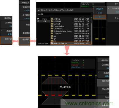 當(dāng)原始波形沒辦法滿足我們對(duì)波形的限制時(shí),用戶還可將儀器內(nèi)部Flash存儲(chǔ)器或外部U盤中存儲(chǔ)的測(cè)試模板文件導(dǎo)入,導(dǎo)入的波形可以是以前保存的*.msk文件或者是自行設(shè)置的*.txt文件。
