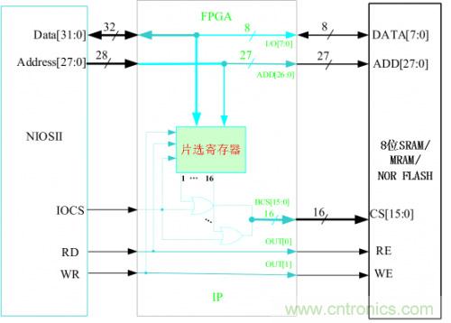 如圖4-2,SRAM、MRAM和NOR FLASH的接口操作基本一致,NIOSII的總線時序完全滿足。故在FPGA內(nèi)部只要簡單的把相應(yīng)的控制線和數(shù)據(jù)線相連就可以了,唯獨(dú)只要設(shè)計(jì)一個片選寄存器,用來區(qū)分SIP的16個片選。每一個片選可以訪問的空間為128MByte。片選寄存器的地址為(基址+0x0FFFFFFC),基地址設(shè)在NIOSII 外部總線的最高地址位。