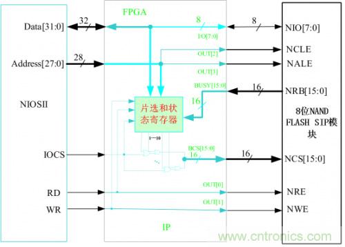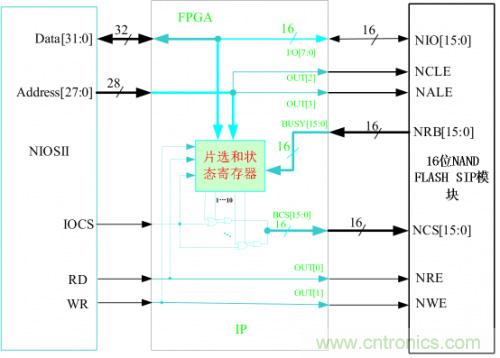 16位的NAND FLASH存儲器芯片可以有多種組合方式,可以用多個16位的NAND FLASH組合,也可以用多個8位的NAND FLASH組合。這里我們假設(shè)16位的SIP NAND FLASH產(chǎn)品是由多個16位的NAND FLASH組合而成,下面的IP核是根據(jù)它的結(jié)構(gòu)來設(shè)計(jì)的。