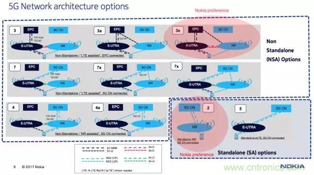 對(duì)于5G組網(wǎng),3GPP在去年釜山會(huì)議上由德國電信提出了12種組網(wǎng)選項(xiàng)。其中選項(xiàng)3/3a/3x、7/7a/7x、4/4a為非獨(dú)立組網(wǎng)構(gòu)架,選項(xiàng)2、5為獨(dú)立組網(wǎng)構(gòu)架。