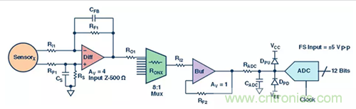 第二級,將放大器的輸出信號施加到多路復(fù)用器的 8 個輸入端 (圖3)。每個輸入以一個阻尼電阻 (RO) 進(jìn)行緩沖,以減少多路復(fù)用器通道切換導(dǎo)致的電荷反沖。根據(jù)多路復(fù)用器數(shù)據(jù)手冊規(guī)定的技術(shù)規(guī)格,每個通道的內(nèi)部會設(shè)有一些寄生電容或額定 RO。