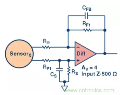 第一級,一個簡單的差分放大器 (圖2)。該放大器的增益為 4×,輸入阻抗為 500 Ω。設(shè)置電容是為了進(jìn)行可選的濾波處理。