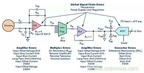 【導(dǎo)讀】整個信號鏈累積起來并且最終會影響到轉(zhuǎn)換器的誤差有多重。但請記住,轉(zhuǎn)換器是信號鏈的瓶頸,最終決定著信號的表示精度。因此,轉(zhuǎn)換器的選擇是設(shè)定系統(tǒng)整體要求的關(guān)鍵。在信號鏈中,可能會累積的誤差有兩類——即直流和交流誤差。直流或靜態(tài)誤差(如增益和失調(diào)誤差)有助于了解信號鏈的精度或靈敏度;交流類誤差也稱為噪聲和失真,限制著系統(tǒng)的性 能和動態(tài)范圍。