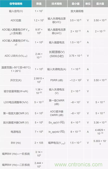 花些時間編制一份電子表格,使其布局合理、有序。在表格頂部,定義全局誤差和信號鏈規(guī)格,因?yàn)檫@些數(shù)據(jù)會影響整個信號鏈的性能。放大器規(guī)格/誤差也放在頂部,因?yàn)檎麄€信號鏈中有多種誤差和兩個放大器級。