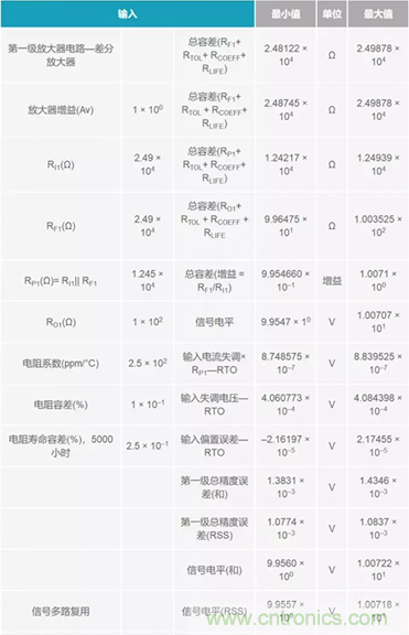 往下,在表格左側(cè),把所有誤差細(xì)分到各電阻級。電阻誤差也細(xì)分到了各個級,以便于了解相應(yīng)的權(quán)衡情況。右側(cè)所示為在信號流進(jìn)流出各級時連讀計算和累計計算的誤差。