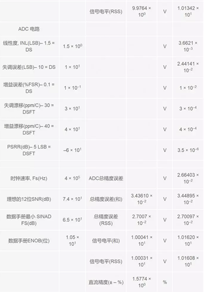 精度可以通過多種方式計算,并且可能表現(xiàn)為多種形式。根據(jù)設(shè)計人員的想法,可以深入了解并記錄所用方法,以避免形成錯誤結(jié)果。請記住,在第一部分,我們提到,如果只是用所有這些誤差源的和方根(RSS)值,結(jié)果可能會過于悲觀。然而,統(tǒng)計容差結(jié)果可能過于樂觀了(總誤差之和除以誤差數(shù))。整個信號鏈的實(shí)際容差應(yīng)當(dāng)介于這兩種思路或方法之間。