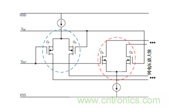 傳統(tǒng)的軌到軌輸入CMOS架構(gòu)具有兩個差分對;一個PMOS晶體管對(藍色)和一個NMOS晶體管對(紅色)。具有軌到軌輸入操作的零漂移放大器使用圖1所示的相同互補p溝道(藍色)和n溝道(紅色)輸入配置。