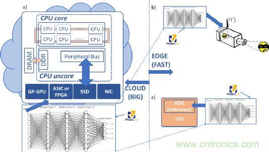 在圖1a中,云數(shù)據(jù)中心服務器利用在大型大數(shù)據(jù)集上訓練的深度學習神經(jīng)網(wǎng)絡來執(zhí)行機器學習的功能。在圖1b中,邊緣設備中的安全攝像機采用經(jīng)過大數(shù)據(jù)訓練的推理引擎來實時識別圖像(快速數(shù)據(jù))。在圖1c中,智能固態(tài)硬盤設備采用推理引擎進行數(shù)據(jù)識別和分類,從而有效地利用了此設備的帶寬。圖1展示了RISC-V內核的潛在機會,它可以自由地添加專有的及未來標準化的矢量指令,這些指令對于處理深度學習和推理技術相當有效。