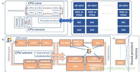 CPU 外圍核心及網(wǎng)絡接口控制器的作用將成為支持數(shù)據(jù)移動的關鍵因素。CPU外圍核心組件必須支持密鑰內存和永久內存接口(例如NVDIMM-P),也必須支持駐留在CPU附近的內存。還需要實施面向計算加速器、智能網(wǎng)絡和遠程持久內存的智能快速總線。這種總線上的任何設備(例如CPU、通用或專用計算加速器、網(wǎng)絡適配器、存儲器或內存)都可以包含其自己的計算資源并具有訪問共享內存的能力(圖2b和圖2c)。
