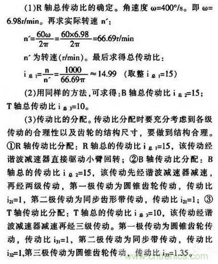 諧波齒輪減速器是一種新型的機(jī)械傳動(dòng)變速機(jī)構(gòu)。 與普通齒輪傳動(dòng)相比,具有體積小,重量輕,結(jié)構(gòu)簡單。它與傳動(dòng)比相當(dāng)?shù)钠胀p速器比較,其零件減少50%。 體積和重量均減少l,3左右或更多。傳動(dòng)比范圍大(單級傳動(dòng)比為40~350,多級傳動(dòng)比可達(dá)1600~100000),傳動(dòng)效率高(單級傳動(dòng)效率饑≥85%),傳動(dòng)精度高。承載能力強(qiáng)等特點(diǎn)。 根據(jù)所選擇的電機(jī),選擇型號為SGMAH—OIA,額定功率為loo W,額定轉(zhuǎn)矩為0.318 N·m,額定轉(zhuǎn)速為 3000 drain的交流伺服電動(dòng)機(jī)。同時(shí)選擇XBl諧波減速機(jī),機(jī)型為25,減速比為40,輸出力矩為1.0N·m,輸入轉(zhuǎn)速為3000 r/min。為了訂貨和維修方便,三軸均采用同一種減速器。