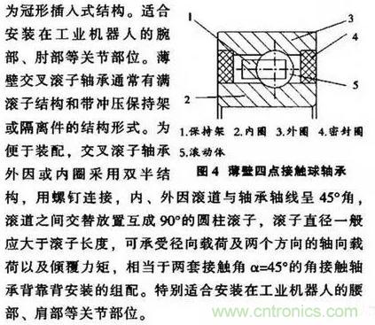 球軸承是機(jī)器人和機(jī)械手機(jī)構(gòu)中最常用的軸承。它能承受徑向和軸向載荷,摩擦較小。其機(jī)器人專用軸承四點(diǎn)接觸式設(shè)計(jì)以及高精度加工。這種軸承比同等軸徑的常規(guī)中系列四點(diǎn)接觸軸承輕25倍。它的內(nèi)圈(或外圈)由兩個(gè)半圈精確拼配而成,而其整體外圍(或內(nèi)圈) 的溝曲率半徑較小,使鋼球與內(nèi)、外圈在四個(gè)“點(diǎn)”上接觸。既加大了徑向負(fù)荷能力,又能以緊湊的尺寸承受很的兩個(gè)方向的軸向負(fù)荷,并且有很好的兩個(gè)方向的軸向限位能力,因?yàn)樗妮S向游隙相對較小。而其接觸角 (一般取為35)又較大。工業(yè)機(jī)器人專用薄壁四點(diǎn)接觸球軸承通常有帶密封圈和不帶密封圈的結(jié)構(gòu)形式(見圖4)。其主要由內(nèi)圈、外 圍、保持架、鋼球或非接觸式密封圈組成。內(nèi)、外圈均為整體結(jié)構(gòu)。鋼球與內(nèi)、外因溝道呈四點(diǎn)接觸.保持架為冠形插入式結(jié)構(gòu)。