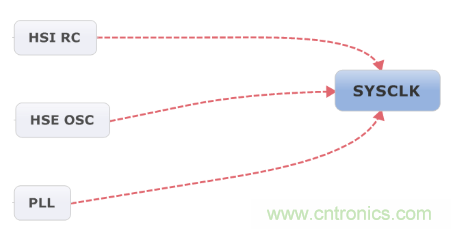 1、 SYSCLK時(shí)鐘源有三個(gè)來源:HSI RC、HSE OSC、PLL