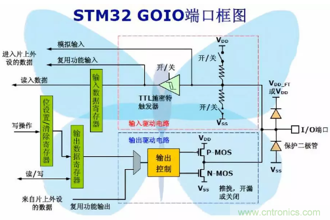 3、 GPIO口貌似有兩個(gè)反向串聯(lián)的二極管用作鉗位二極管。