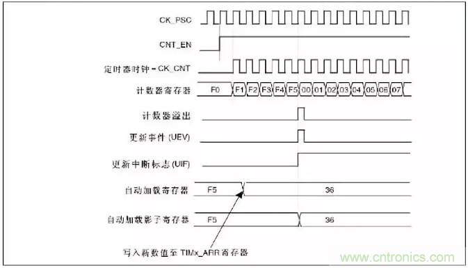 實(shí)際起作用的是影子寄存器,而程序員操縱的則是自動(dòng)裝載寄存器。如果APPE位使能,表明自動(dòng)裝載寄存器的值在下一次更新事件發(fā)生后才寫入新值。