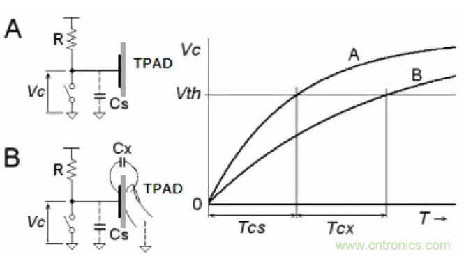 11、電容觸摸屏原理:通過充放電的曲線不同來檢測是否被按下。 實(shí)際的實(shí)驗(yàn)過程中,TPAD可以用一塊覆銅區(qū)域來替代,通過電容的充放電常數(shù)來確定是否按下。